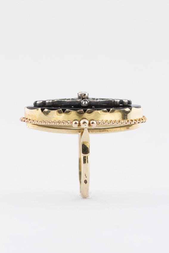 14 krt. gouden ring met onyx en 12 diamanten in zilver gezet.