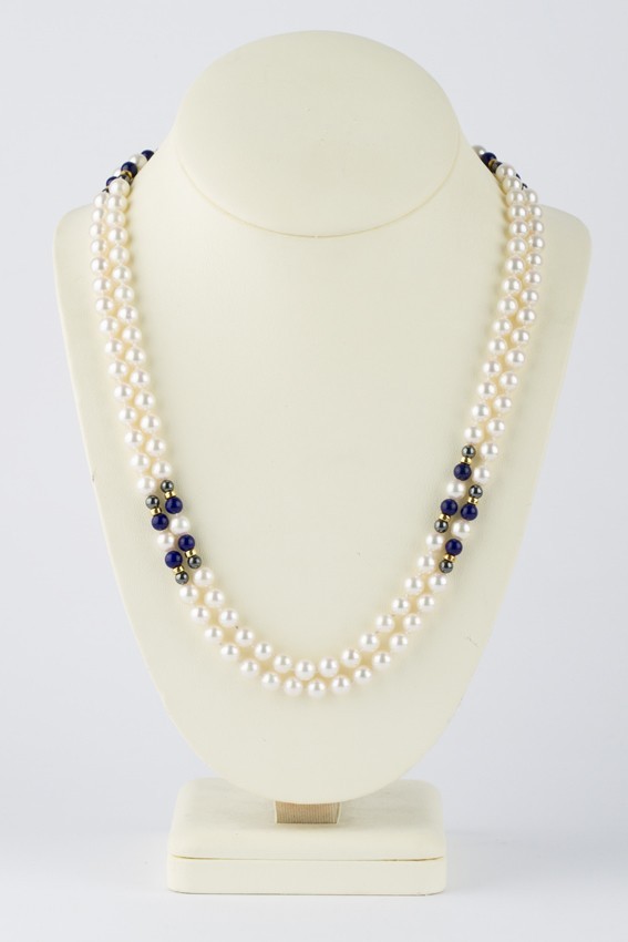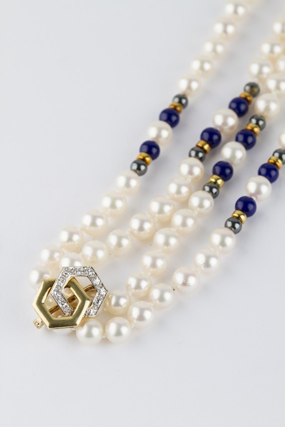 Lang cultivé parel collier afgewisseld met hematiet en lapis lazuli inclusief een 14 krt. gouden parel clip met 10 diamanten (8-kant).