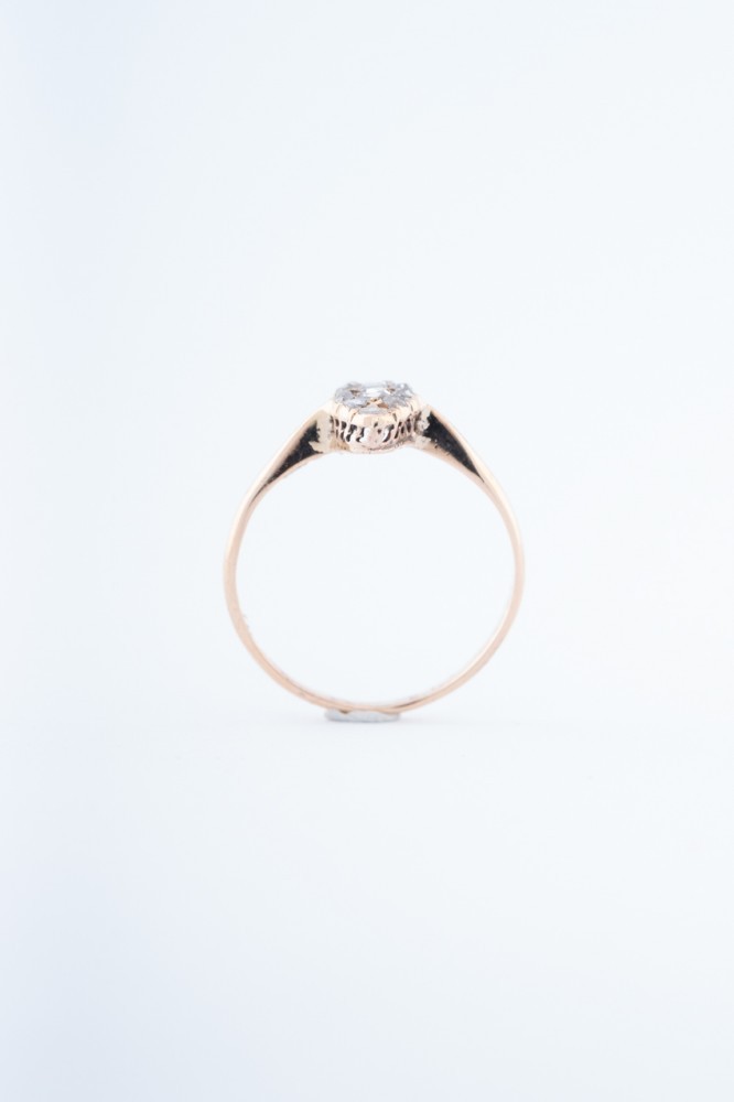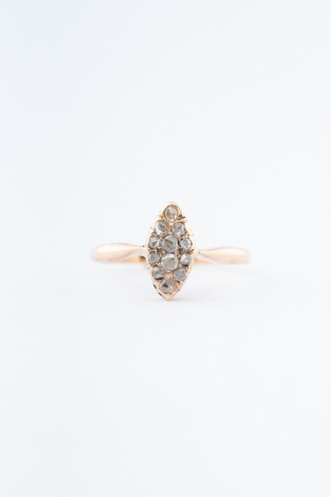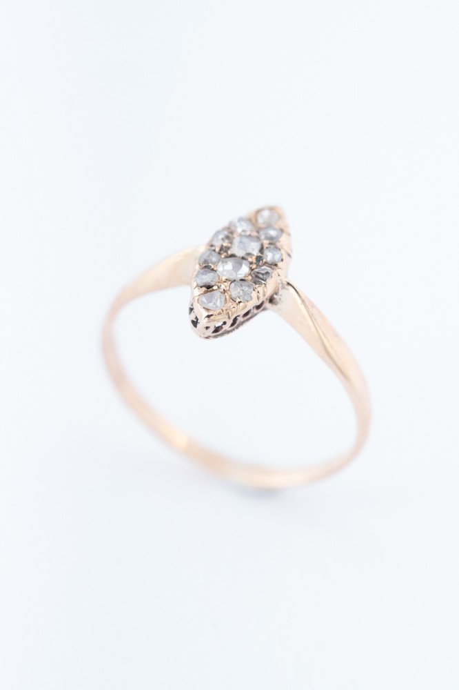 Antieke markies ring met roos geslepen diamanten. Gehalte: 0.520 dzn. AU (Bwg).