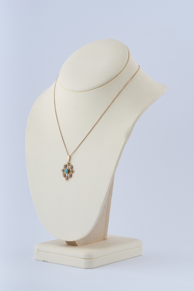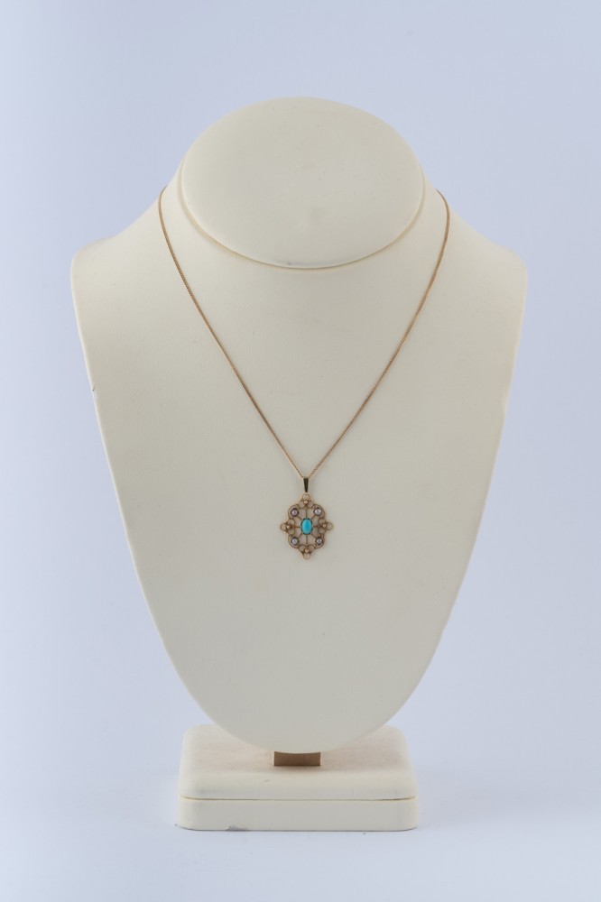 Oude 14 krt. gouden hanger met turkoois en parels aan 18 krt. gouden gourmet collier.