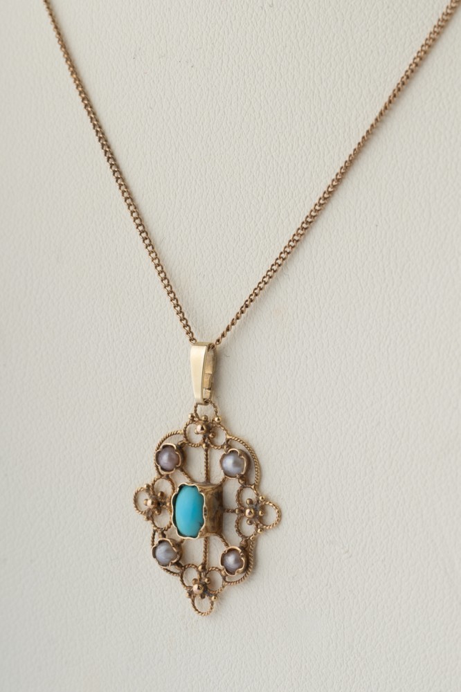 Oude gouden hanger met turkoois en parels aan ouden gourmet collier