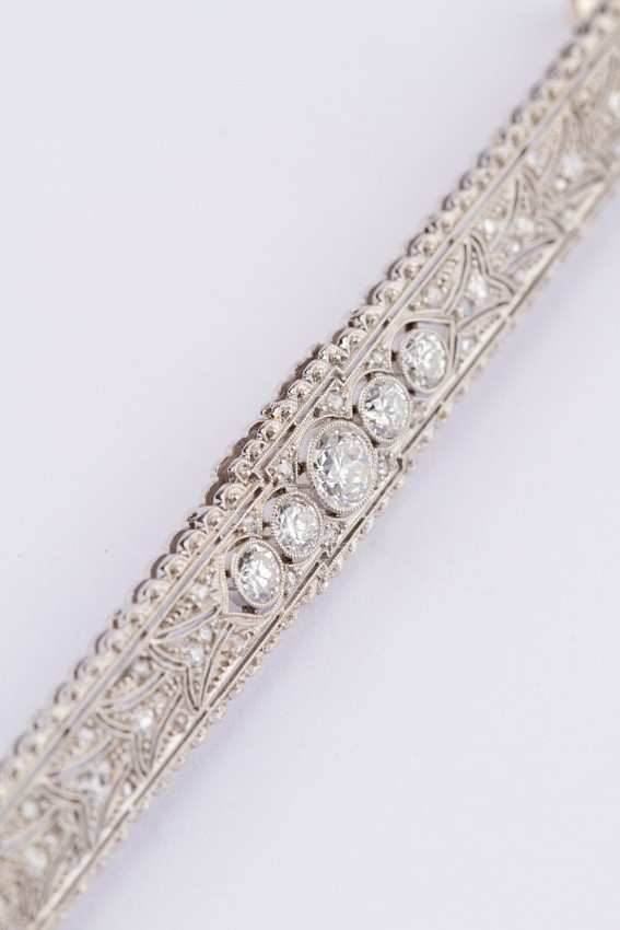 Platina brochette met 5 briljanten, 10 diamanten (8-kant) en 40 roos geslepen diamanten. Totaal ca. 0.60 ct.