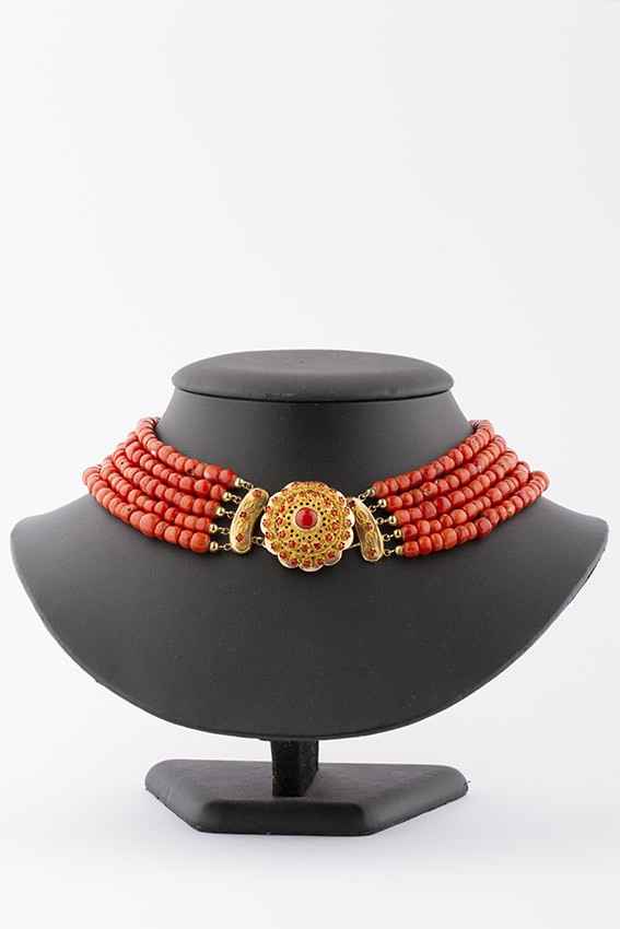 5-strengs bloedkoralen collier aan 14 krt. gouden klederdracht slot.