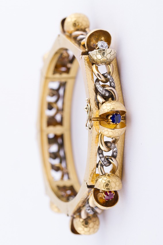 Antieke 18 krt. gouden armband met open scharnierende bollen waarin edelstenen w.o. oud geslepen briljant, saffier, robijn en smaragd die zichtbaar worden bij het dragen. Tussenliggende schakels zijn bezet met roos diamanten.