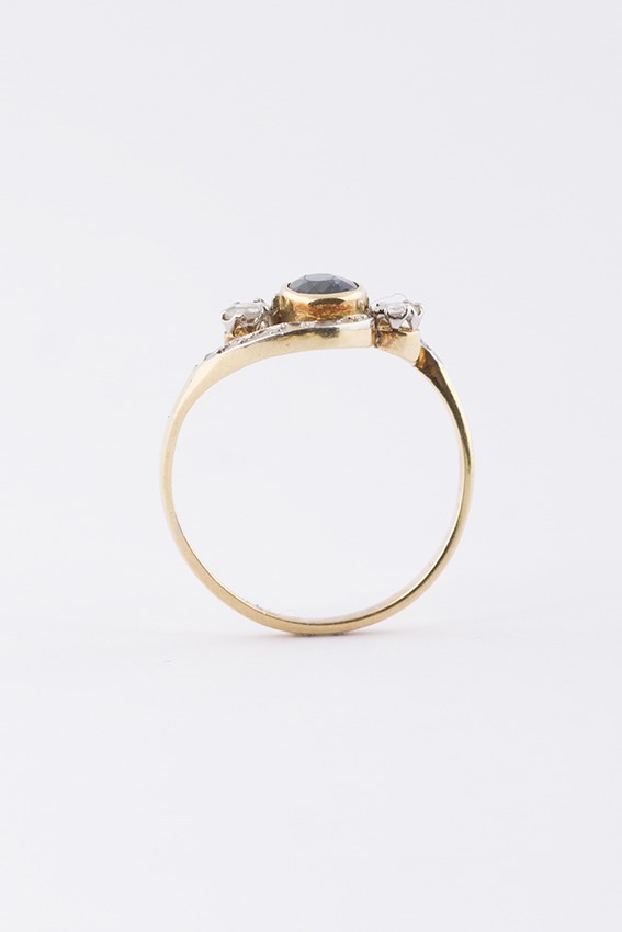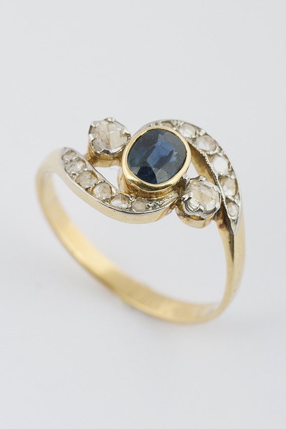 Antieke 18 krt. gouden slag ring met saffier en roos geslepen diamanten.