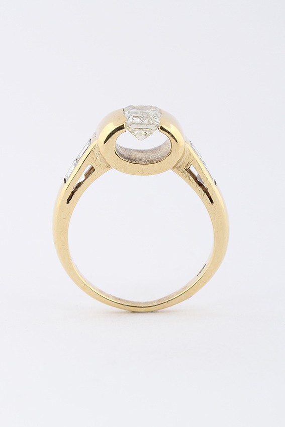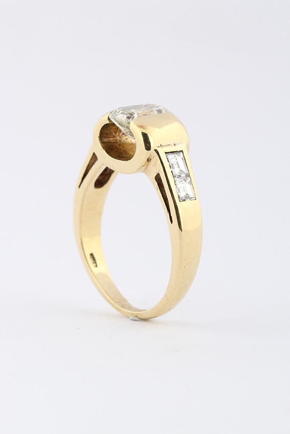 18 krt. gouden ring met grote diamant (smaragd slijpsel) en 4 carré geslepen diamanten.