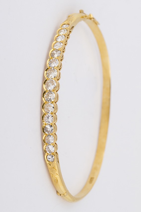 18 krt.gouden stijve rivière armband met 15 briljanten. Totaal ca. 2.30 ct.