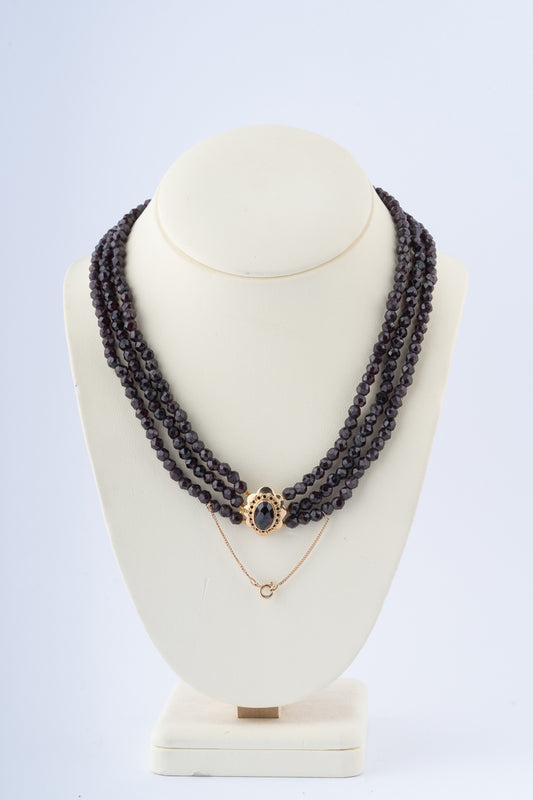 3-strengs granaten collier aan gouden sluiting met een granaat