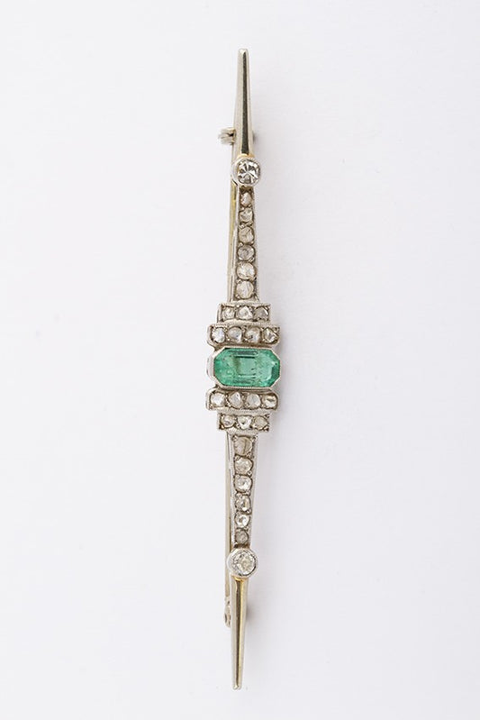 9 krt. Art Déco brochette met smaragd en diamanten