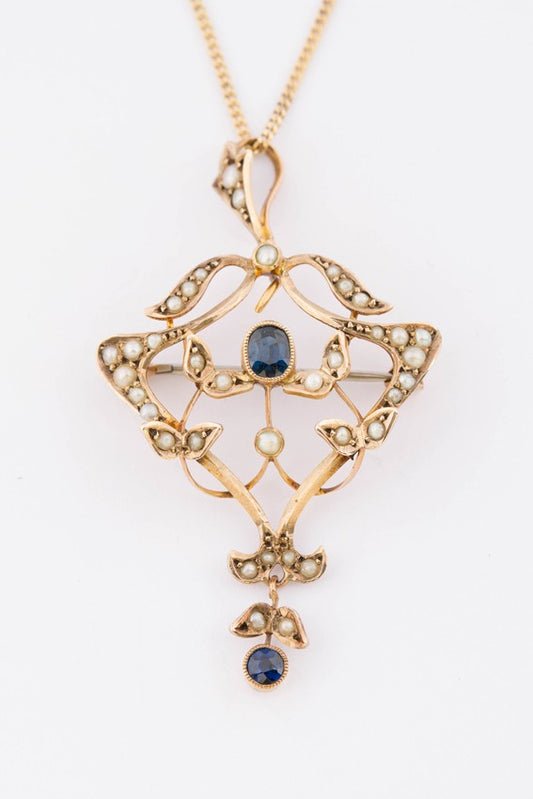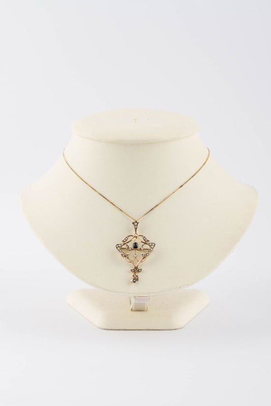 Antieke 9 krt. engelse victoriaanse hanger met saffier en parels (beneden wettelijk gehalte) aan 14 krt. gouden gourmet collier.