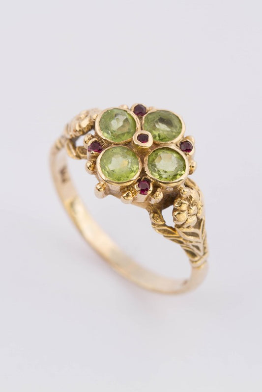 9 krt. victoriaanse ring met peridoot en robijnen