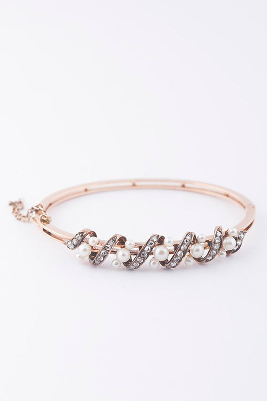 Antieke 14 krt. gouden armband met cultivé parels en roos diamanten.