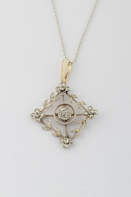 Antieke wit/geel gouden Art Nouveau hanger met een oud geslepen briljant en roos diamanten aan 14 krt. wit gouden collier.