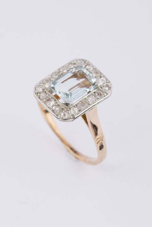 Antieke gouden entourage ring met aquamarijn en diamanten