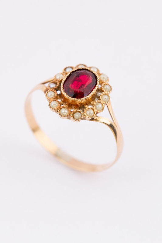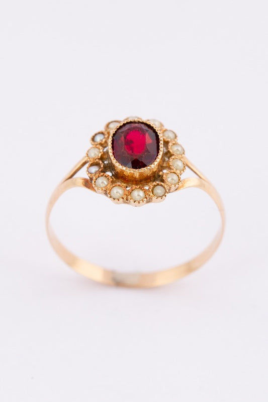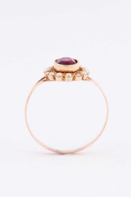 Antieke gouden entourage ring met parels en granaat