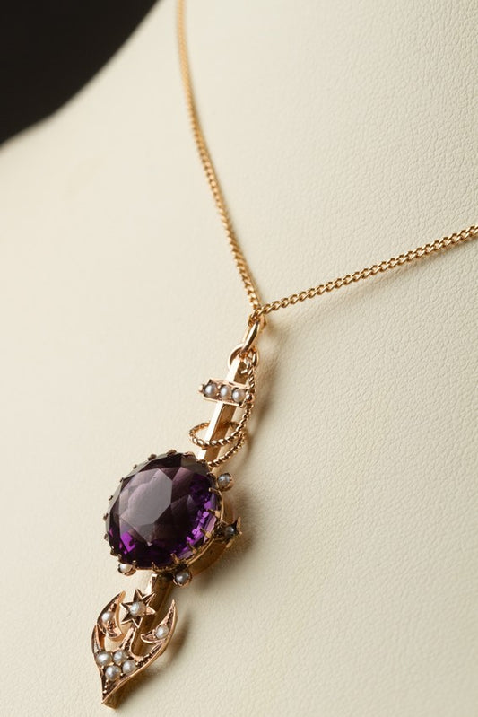 Antieke gouden hanger met amethist en parels aan gouden collier