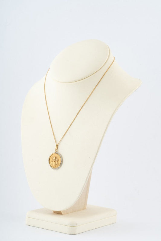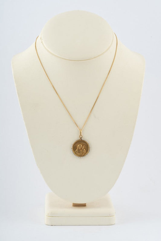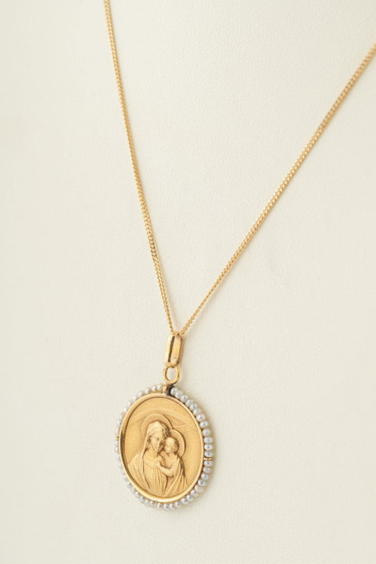 Antieke gouden Maria met kind hanger met parels aan gouden gourmet collier