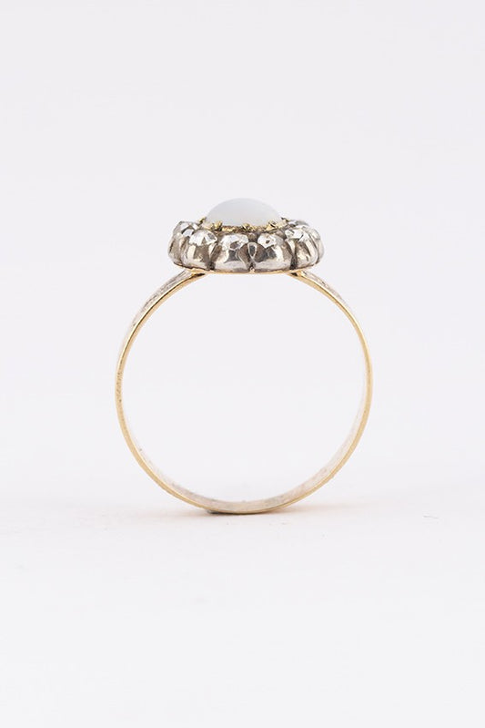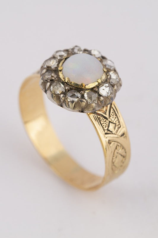 Antieke 18 krt. gouden ring met opaal en diamanten in zilver gezet. 19e eeuw.