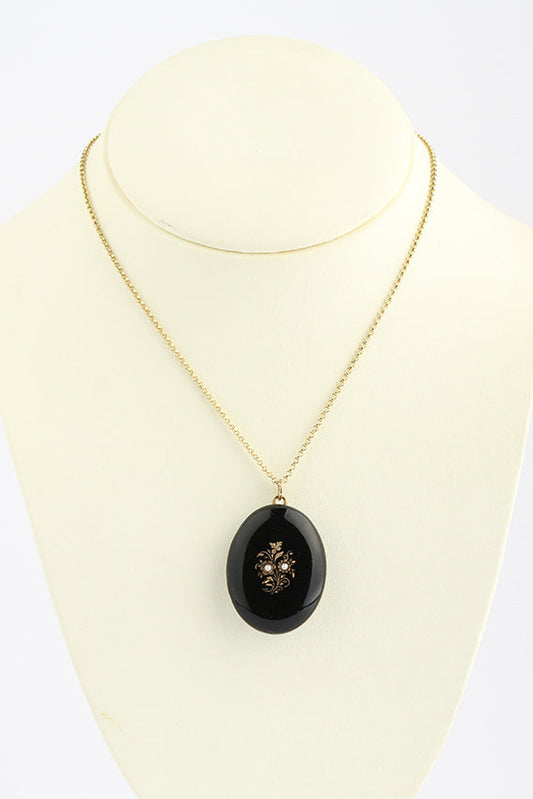 Antieke goud/zilveren memory hanger met parels en emaille aan 14 krt. gouden jasseron collier.