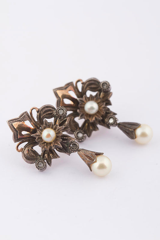 Antieke goud met zilveren oorhangers met roos diamanten en cultivé parels.