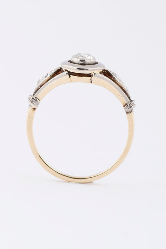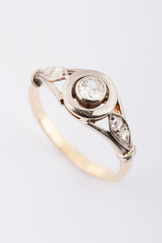 Antieke 14 krt. gouden Art Nouveau ring met een oud geslepen briljant van ca. 0.16 ct. en 4 roos diamanten.
