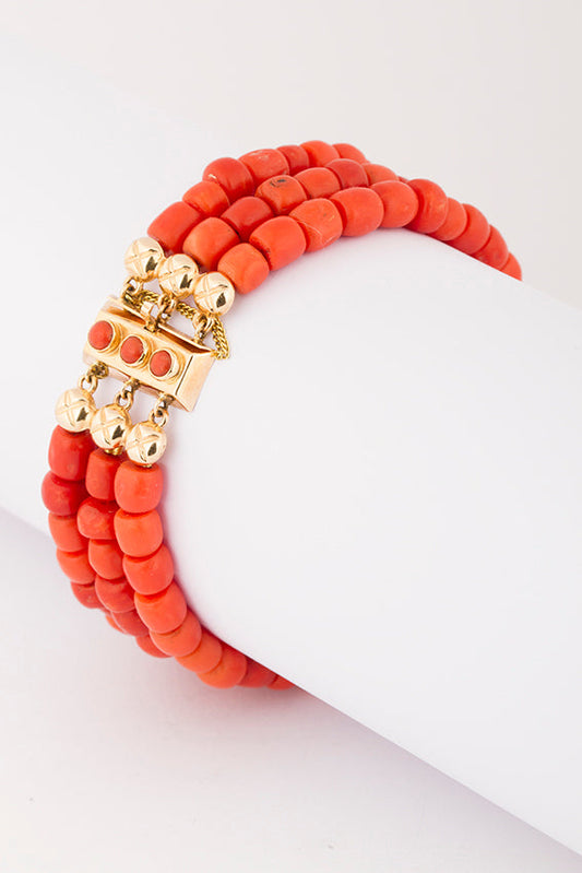 3-strengs bloedkoralen armband aan gouden slot waarin 3 bloedkoralen.