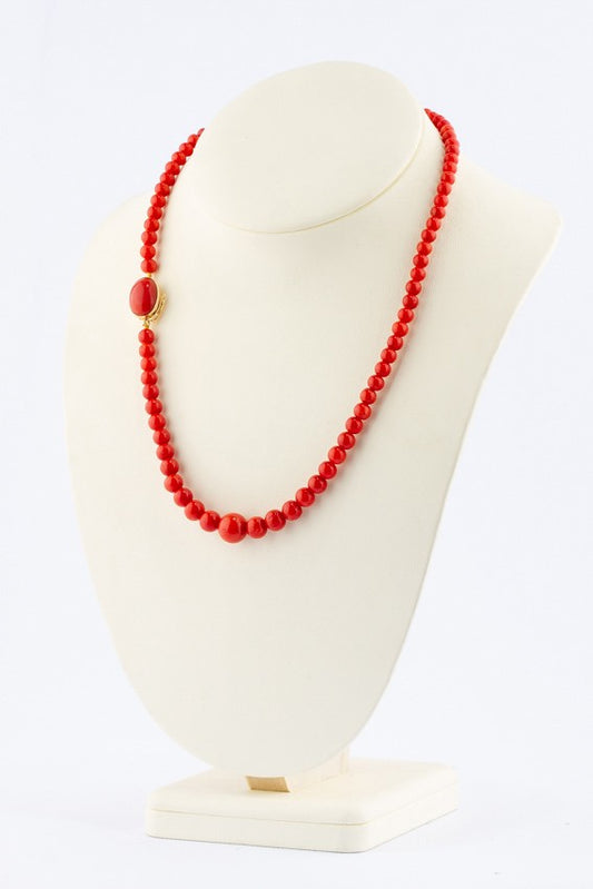 Bloedkoralen collier En-Chute geregen aan 18 krt. gouden sluiting met een bloedkoraal.