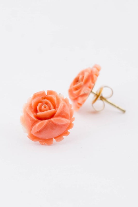 Bloem gesneden bloedkoralen oorknoppen op 14 krt. gouden steker.