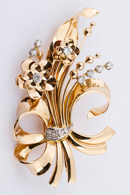 18 krt. gouden bloemen broche met briljant geslepen diamanten. Vijftiger jaren.