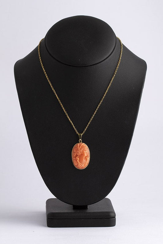 Camée hanger uit bloedkoraal gesneden aan gouden collier