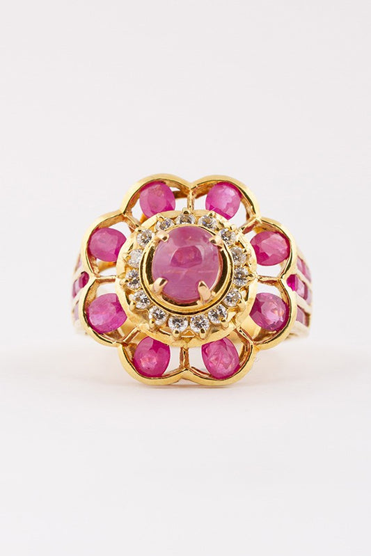 18 krt. gouden dubbele entourage ring met robijn en briljanten.