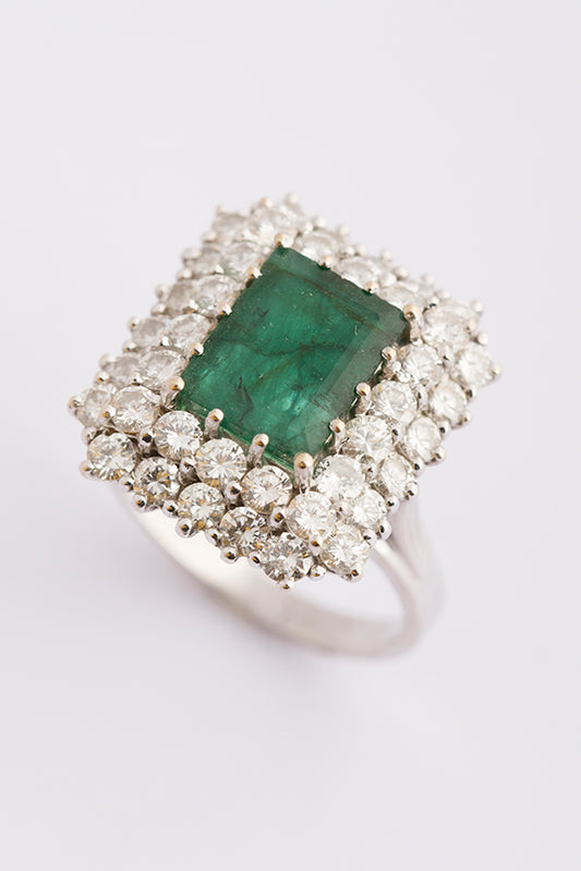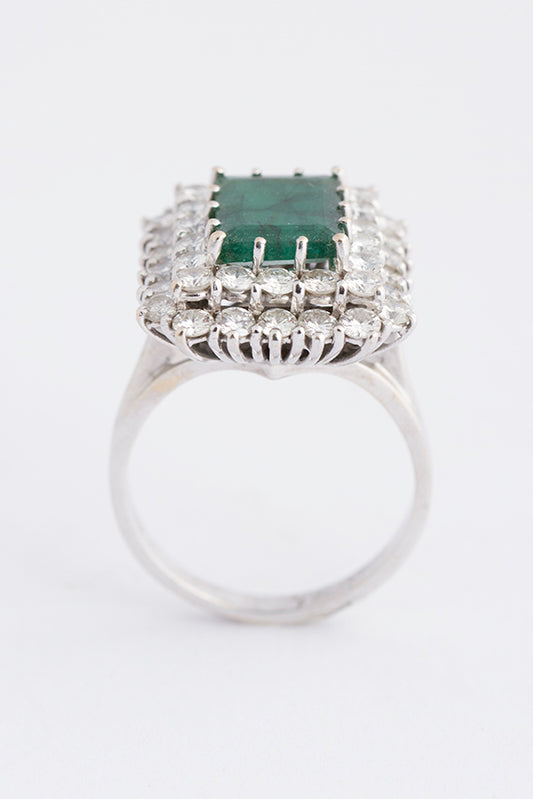 18 krt. wit gouden dubbele entourage ring met 40 briljanten van elk 0.05 ct. Totaal 2.00 ct. en met in het midden een smaragd.