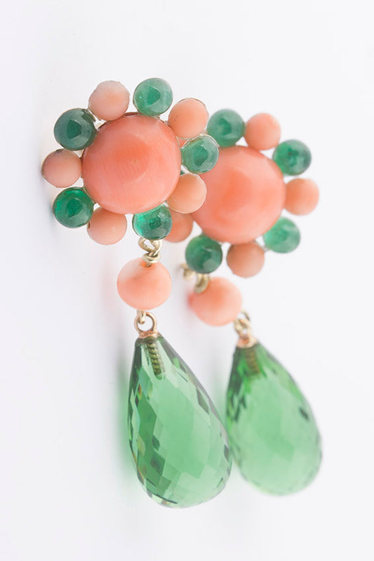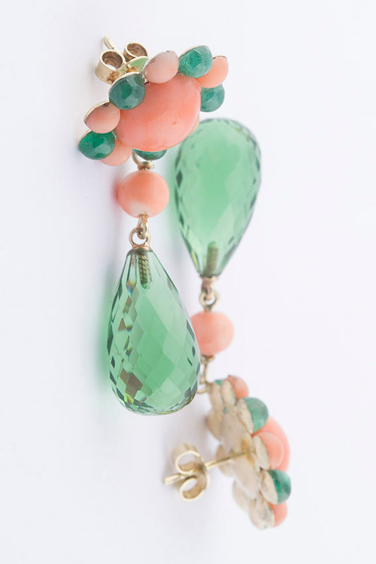 In opdracht voor een klant deze oorhangers met engelenhuid bloedkoraal, cabochon geslepen smaragd met briolet geslepen peridoot (in smaragd kleur) vervaardigd.