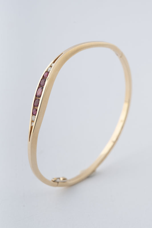 14 krt. geel gouden bangle met 5 robijnen en 4 briljanten.