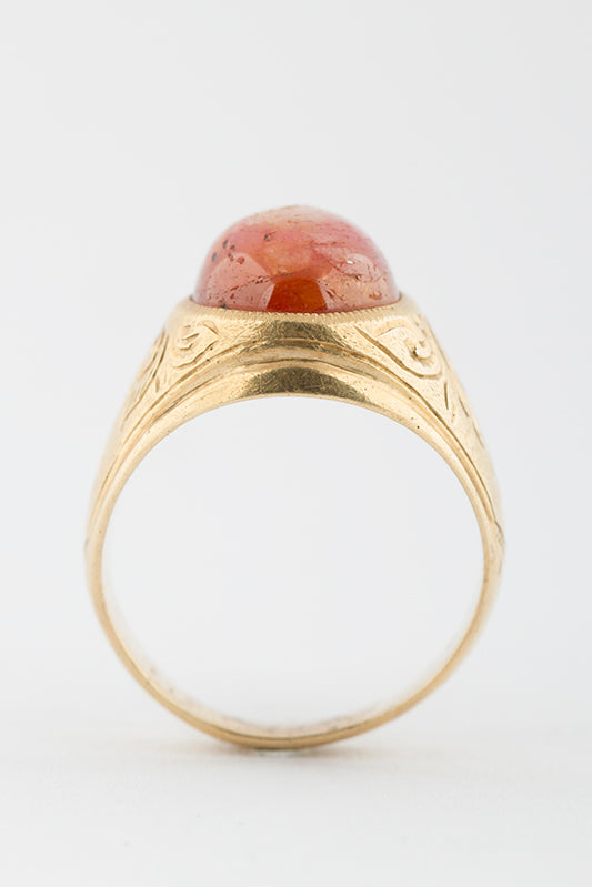 14 krt. gouden gegraveerde bandring met kleur behandelde saffier.