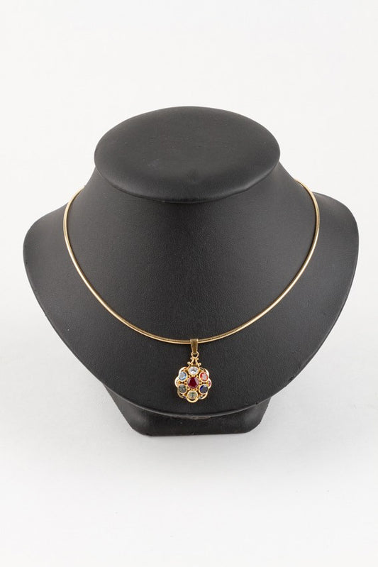 Gouden cocktail hanger met diverse synthetische edelstenen aan gouden collier