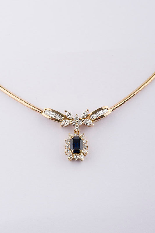 14 krt. gouden collier diverse slijpvormen briljant en saffier. Totaal 1.30 ct.