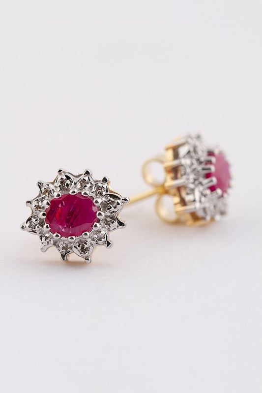 14 krt. gouden entourage oorknoppen met in elk een robijn en diamanten.
