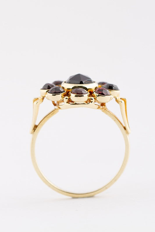 14 krt. gouden entourage ring met granaat.