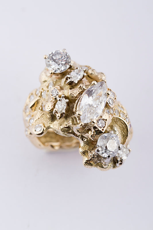 14 krt. gouden fantasie ring bezet met verschillende slijpsels diamant waaronder een markies van ca. 1.00 ct. Totaal ca. 3.50 ct.