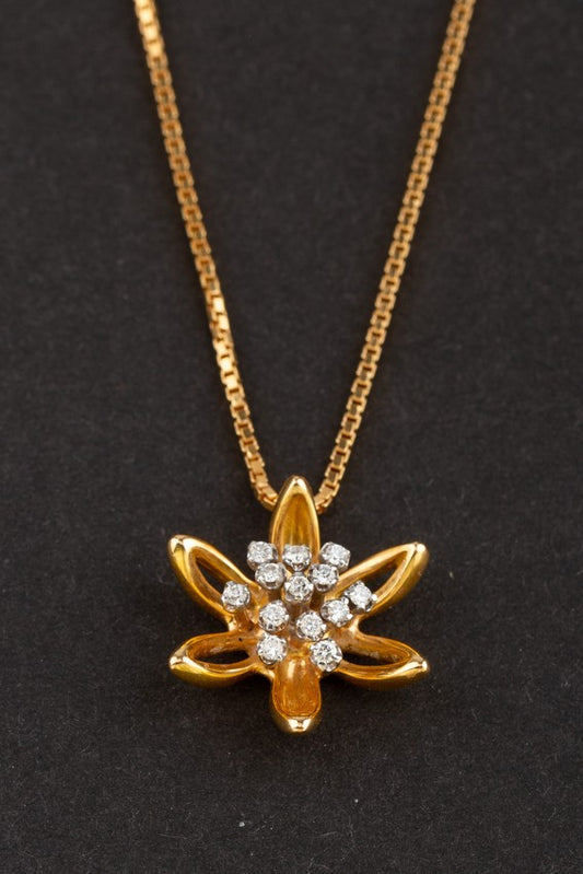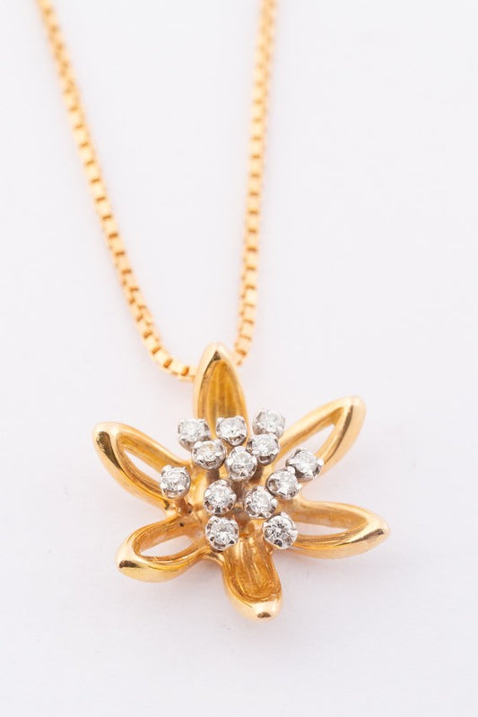 18 krt. gouden bloem hanger met 13 briljanten. Totaal ca. 0.13 ct. aan 18 krt. gouden venetiaans collier. Bijpassende oorknoppen aanwezig in onze webshop.