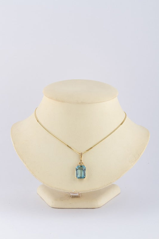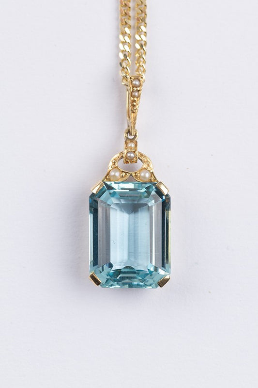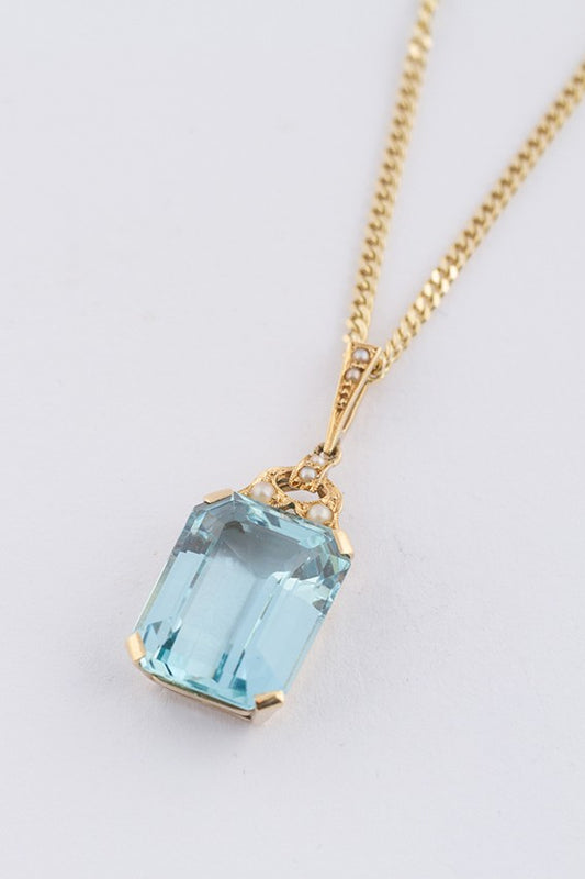 Gouden hanger met natuurlijke aquamarijn en parels aan gouden collier