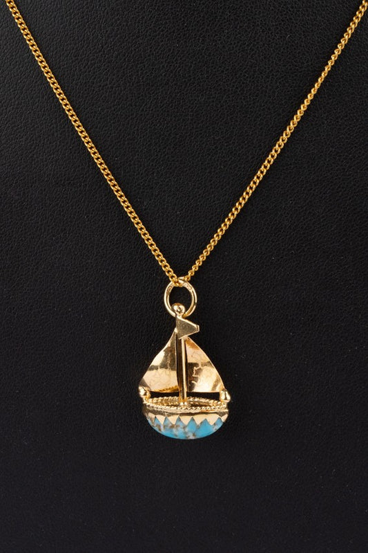 Gouden hanger zeilbootje met turkoois aan gouden collier