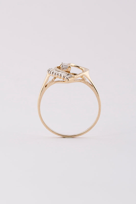 14 krt. gouden hart ring met 16 baguette geslepen diamanten.