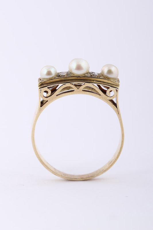14 krt. gouden ring met cultivé parels en roos diamanten.