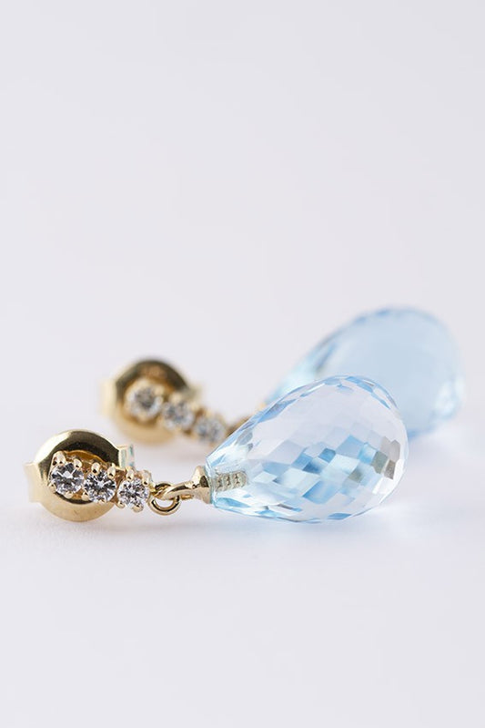 14 krt gouden oorhangers met in elk 3 briljanten(6 x 0.025 ct Totaal 0.15 ct) en een gefacetteerde topaas briolet.