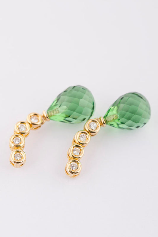 Gouden oorhangers met in elk 4 briljanten en briolet geslepen peridoot.