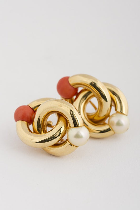 Gouden oorknoppen met cultivé parel en bloedkoraal