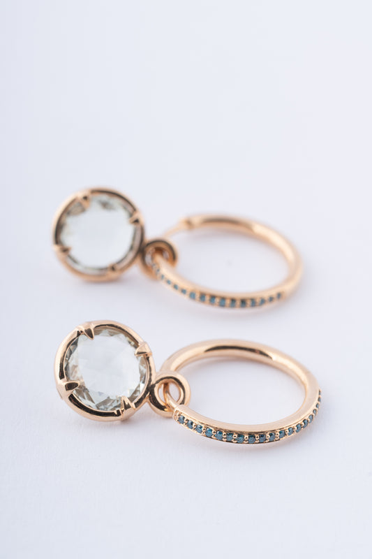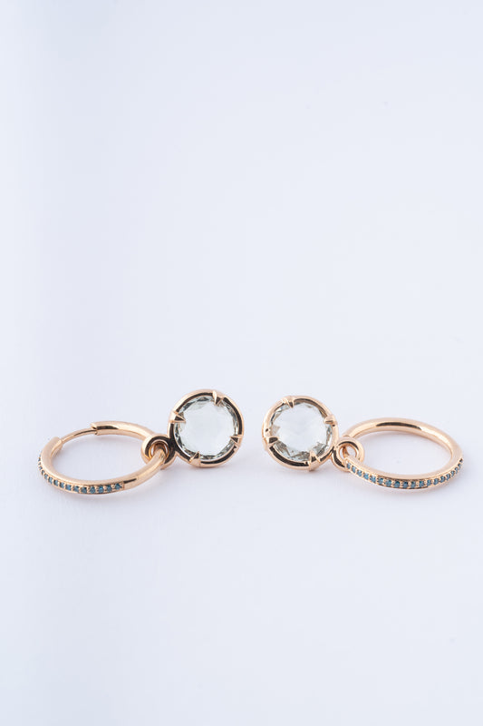 18 krt. gouden oorringen met gekleurde briljanten met aan elk een prasioliet in gouden rand van het merk Bron.