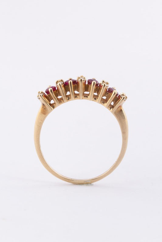 14 krt. gouden rij ring met 4 robijnen en 10 briljanten.
